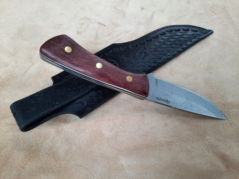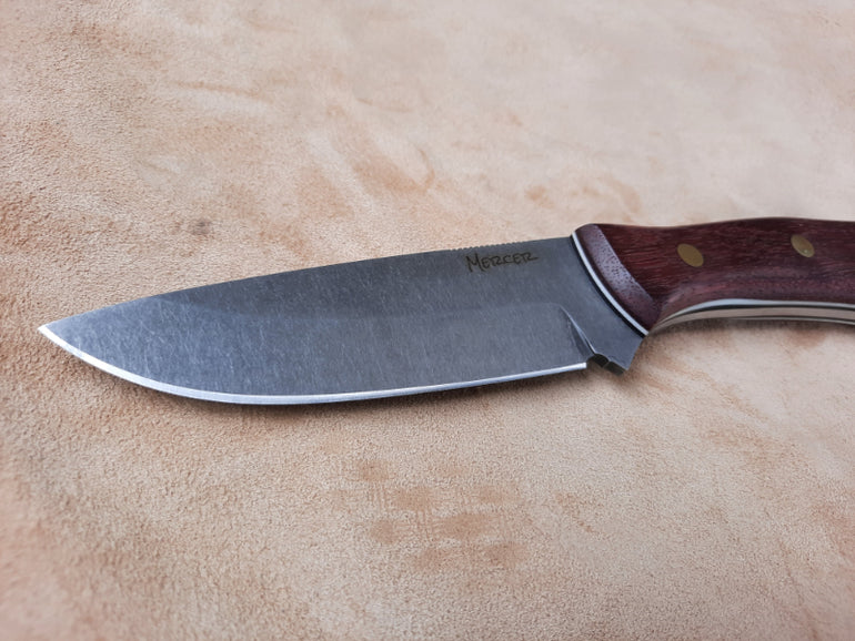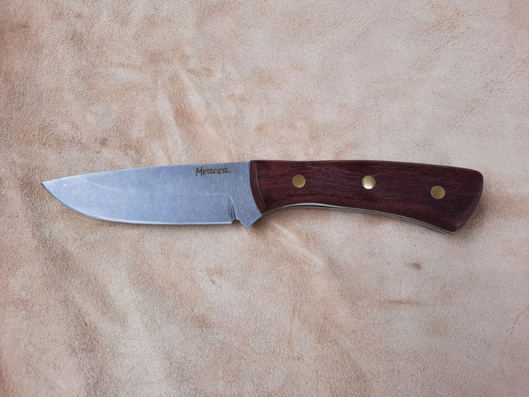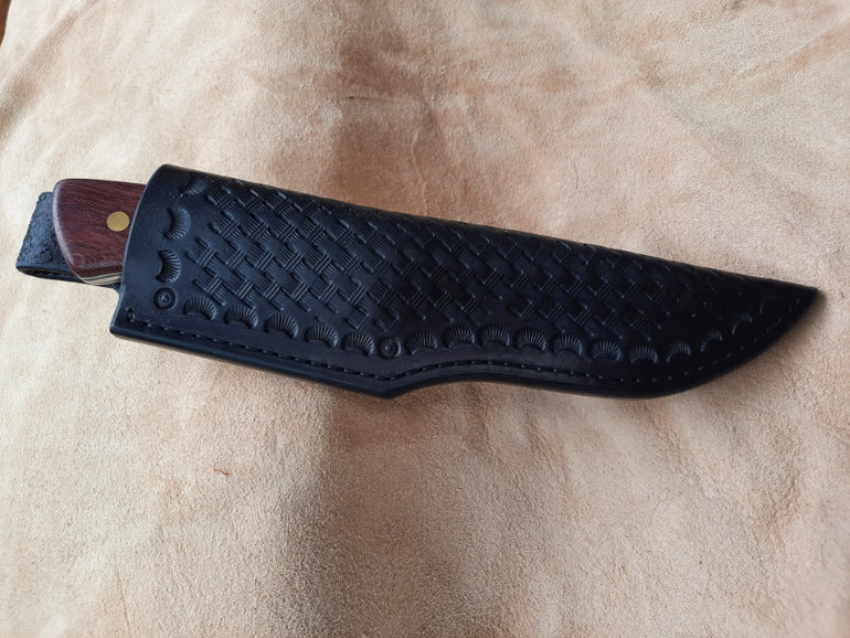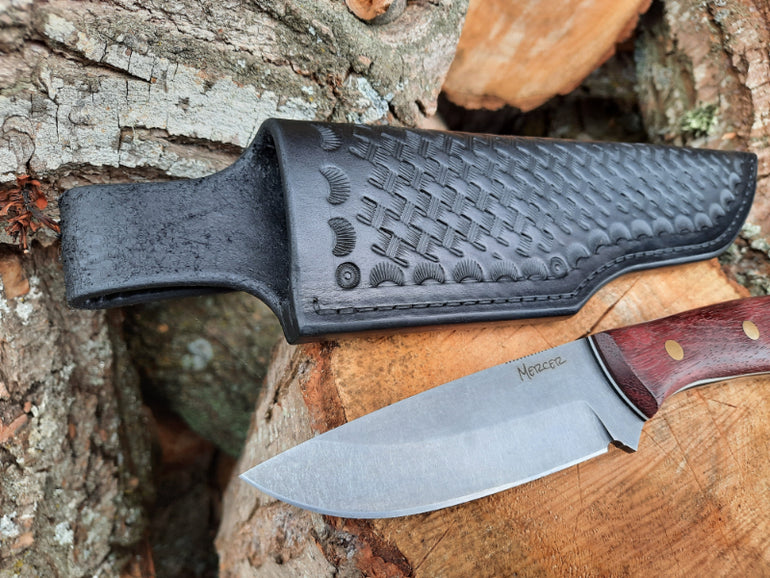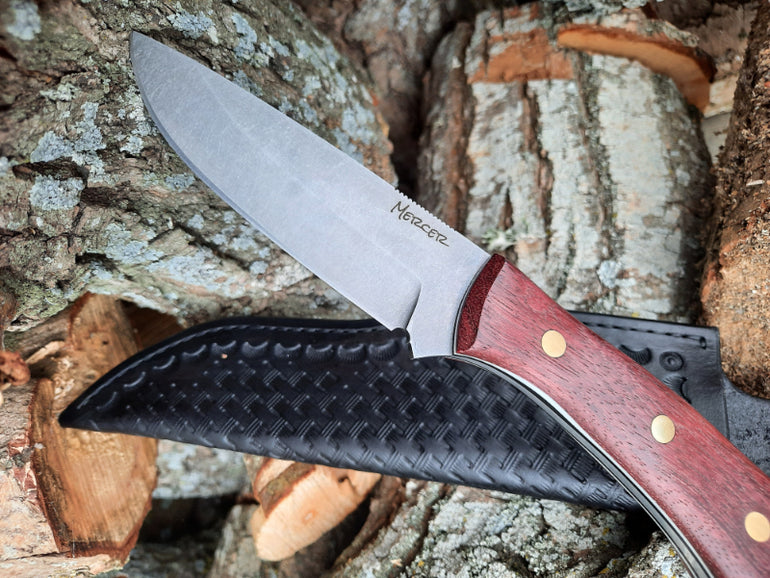 The sheath was handcrafted specifically for this knife. It is a vegetable tanned leather, dyed black, stamped with a basket weave and the Mercer "M" logo.